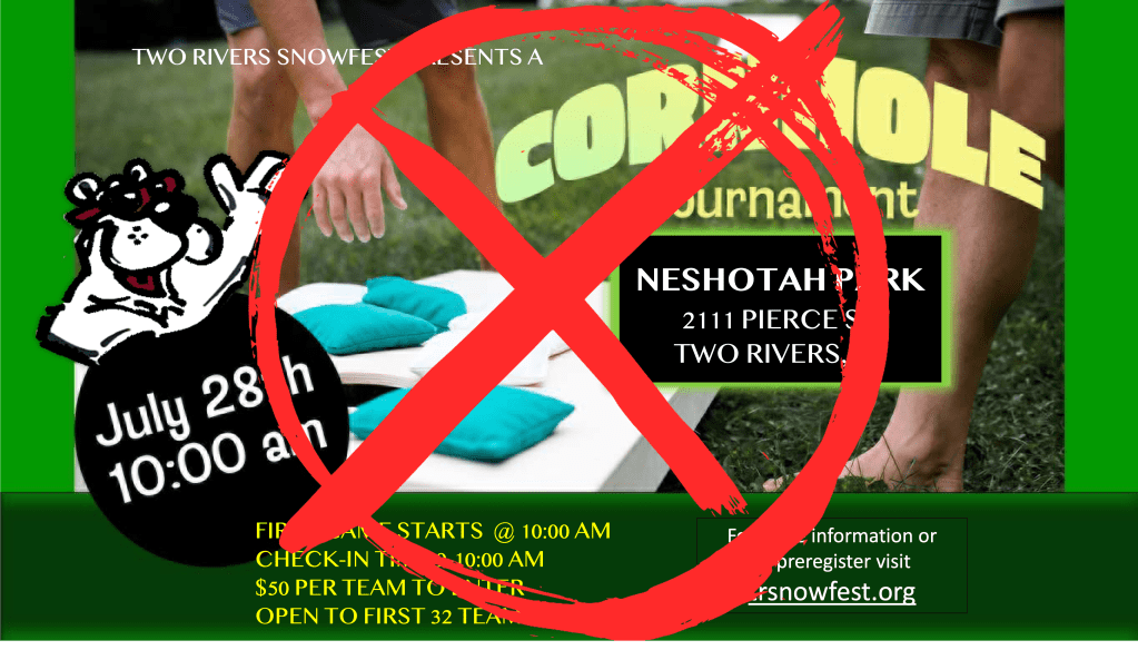 Due to low participation, the SnowFest Cornhole Tournament has been cancelled on Sunday, July 28. Thank you to the teams who did sign up. We are terribly sorry for the inconvenience. Thank you.