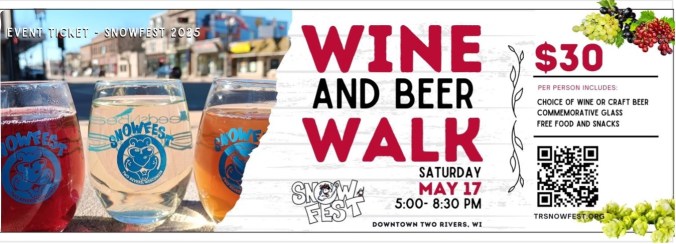 Stroll through downtown Two Rivers and savor an amazing selection of wine and craft beer selections at local businesses and drinking establishments. Eleven stops, seven featured wines and wine tastings by von Steihl Winery out of Algoma, WI, and seven stops featuring unique craft beers brewed by Cool City Brewing Company, Two Rivers. It all happens Saturday, May 17th, from 5-8:30 pm, at the third annual SnowFest Wine and Beer Walk in the heart of Two Rivers. Tag your friends, bring your crew, and let’s make it a night to remember.